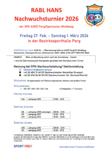Von Freitag, 27. Februar bis Sonntag, 1. März 2026 steht die Bezirkssporthalle Perg ganz im Zeichen des Nachwuchsfußballs! Die SPG ASKÖ Perg/Sportunion Windhaag lädt zum traditionellen RABL-HANS Nachwuchsturnier ein – einem Fixpunkt im regionalen Fußballkalender, bei dem sportlicher Ehrgeiz, Teamgeist und Fairplay im Mittelpunkt stehen.